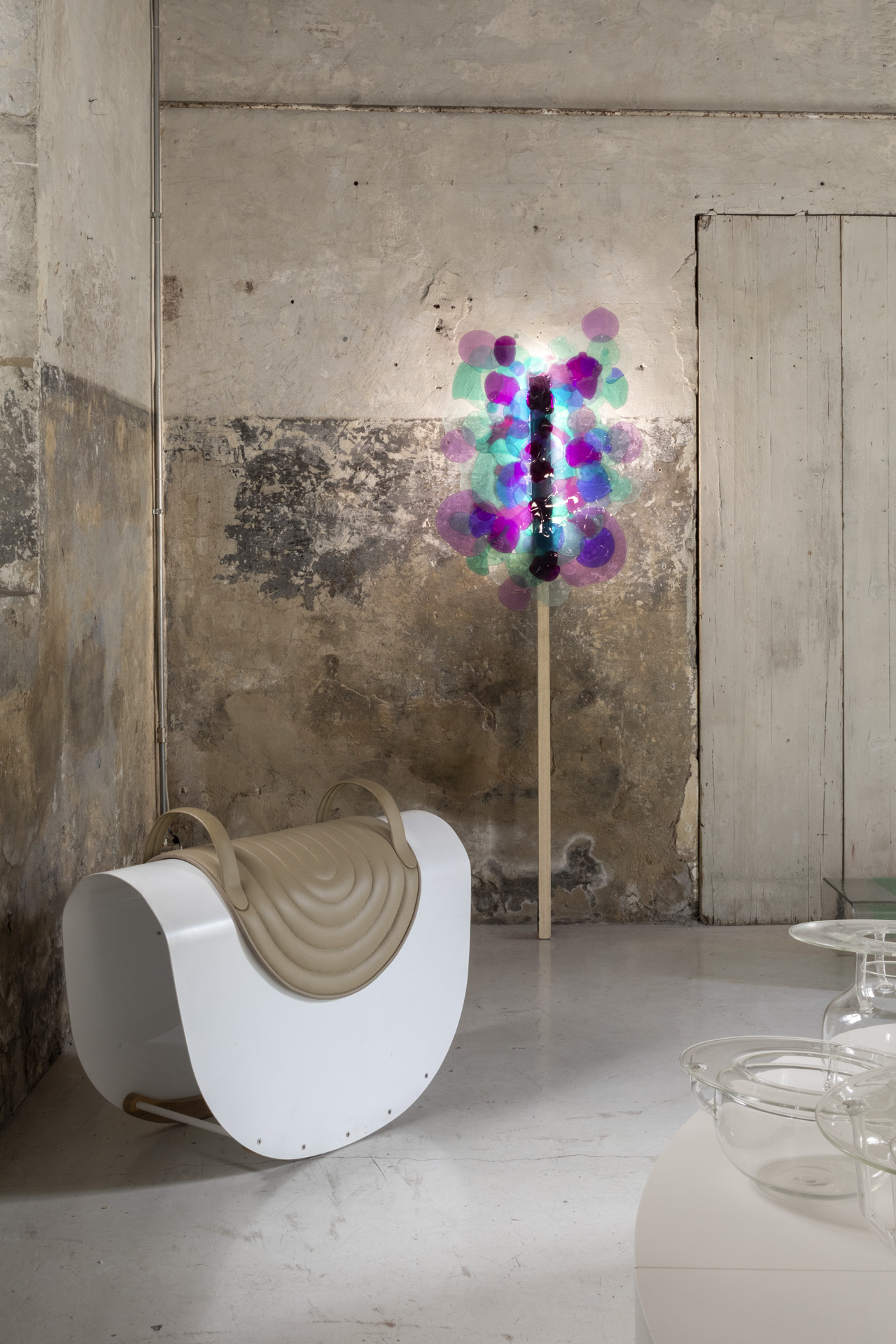 Accanto a questi, la Croce Martello di Giulio Iacchetti in legno e bronzo, i vasi Jambo in gomma riciclata di Serena Confalonieri, le nuvole-specchio Clouds di Onka Allmayer-Beck, e il Tavolo Luna Park di Alessandro Zambelli in vetro di Murano.