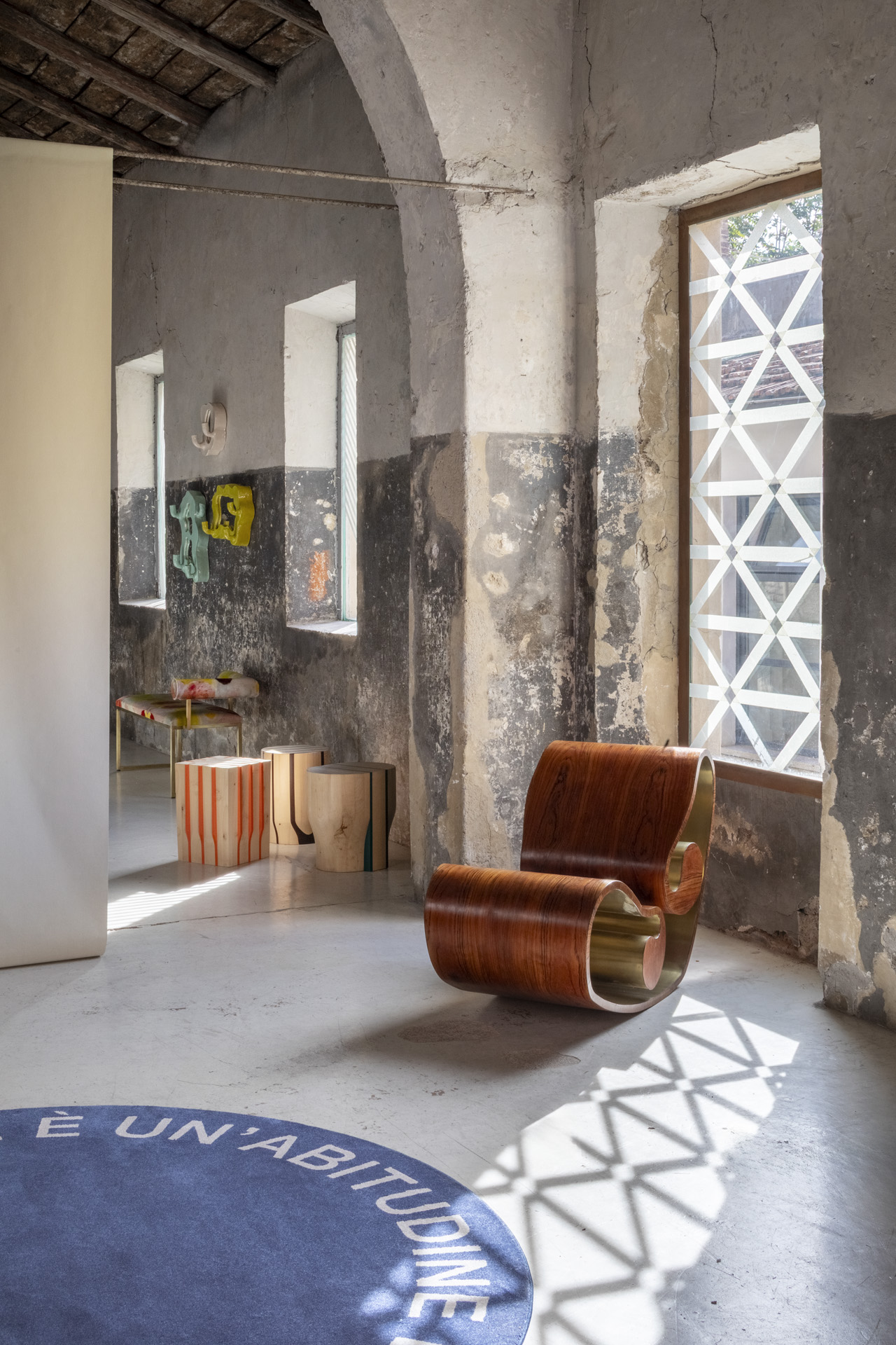 I complementi d’arredo spaziano dalla rocking chair Voluta di Stefano Marolla in legno di palissandro santos e ottone, agli sgabelli Jeunesse di Duccio Maria Gambi, dalla lampada Alter Ego di Studio Pepe allo sgabello Alicedi Clementine Chambon, dalla lampada Bright Future di Matteo Pellegrino a quella Vestale in raso e porcellana dei CContinua+Mamt, fino agli sgabelli Awaiting di Giorgia Zanellato e alla panca rivestita con i tessuti di Coralla Maiuri, alla Rocking chair Rocker di Lanzavecchia + Wai che ricorda un cavallo a dondolo.